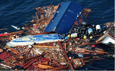 Bộ Môi trường Nhật Bản ước đoán, khoảng 5 triệu tấn rác bị sóng thần cuốn ra đại dương trong thảm họa kép năm 2011. Tuy nhiên, người ta cho rằng chỉ 30% số đó có khả năng trôi nổi trên Thái Bình Dương rộng lớn. Phần còn lại đã chìm xuống đáy biển không lâu sau khi bị kéo tuột khỏi đất liền.