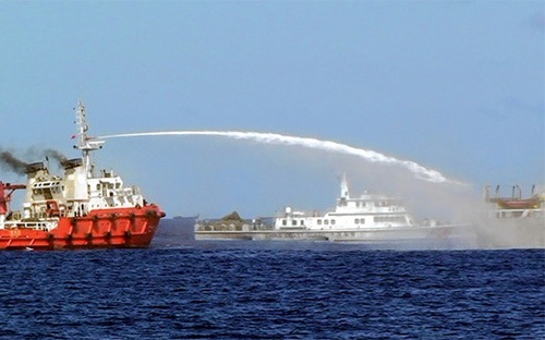 Tàu Trung Quốc dùng vòi rồng tấn công tàu Việt Nam, gần khu vực có giàn khoan Hải Dương Thạch Du-981 tháng 5/2014 – Ảnh: AP.