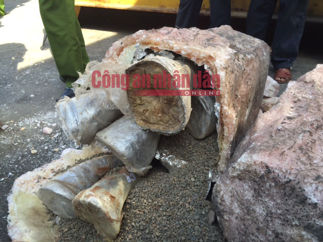 Sau khi tháo dỡ phát hiện 8/16 kiện hàng của container này có chứa các khối đá giả. Trong các khối đá giả này các đối tượng đã cất giấu sừng tê giác và ngà voi.