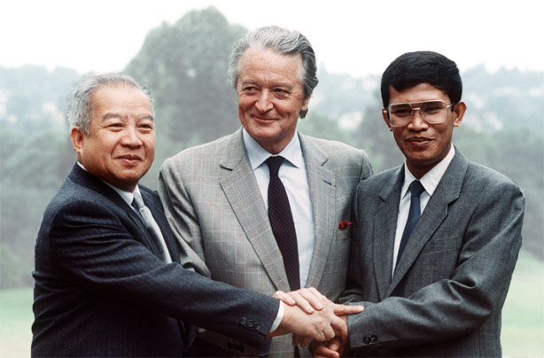 Từ trái qua phải: Quốc vương Norodom Sihanouk, Ngoại trưởng Pháp thời bấy giờ Roland Dumas và