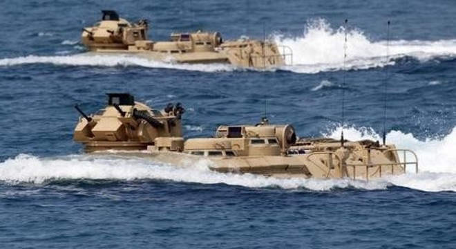 Binh sĩ Mỹ trên xe bọc thép lội nước (AAV) ở gần bờ biển San Antonio, tỉnh Zambales (Philippines) trong cuộc tập trận Vai kề vai ngày 21/4/2015. Ảnh: Reuters