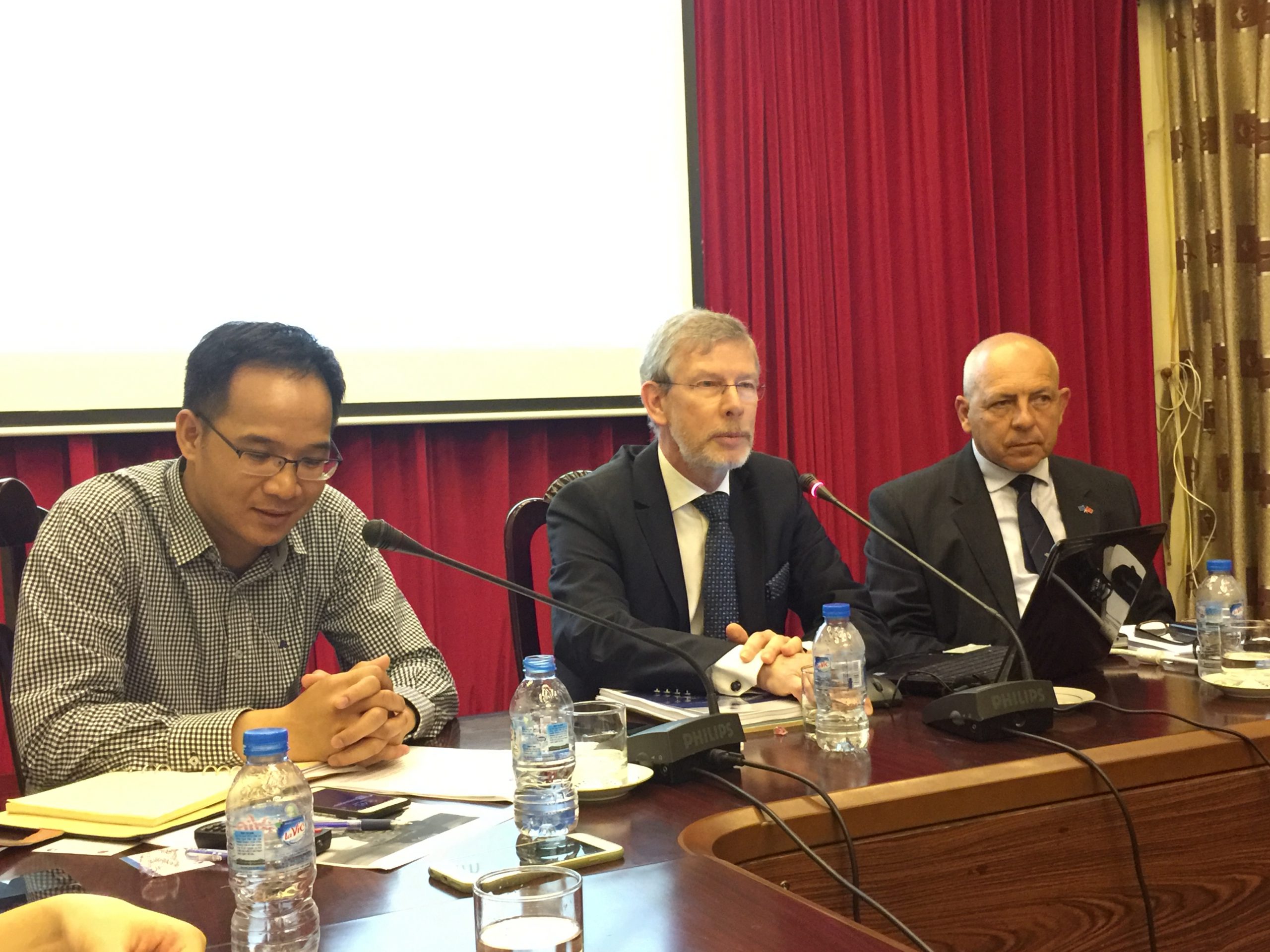 TS Trần Trường Thuỷ, Phó Viện trưởng Viện Nghiên cứu Biển Đông, GS Erik Franckx và Phó Đô đốc Michiel Hijmans (từ trái sang) tham gia toạ đàm.