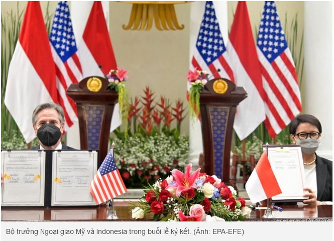 Mỹ và Indonesia hôm 14/12 đã ký một số MOU về các lĩnh vực, trong đó có hợp tác hàng hải. Buổi ký kết diễn ra trong chặng đầu tiên chuyến công du 4 ngày đến Đông Nam Á của Ngoại trưởng Mỹ Antony Blinken, có sự tham gia của Bộ trưởng Ngoại giao Indonesia Retno Marsud và Bộ trưởng Bộ Giáo dục Indonesia Nadiem Makarim.