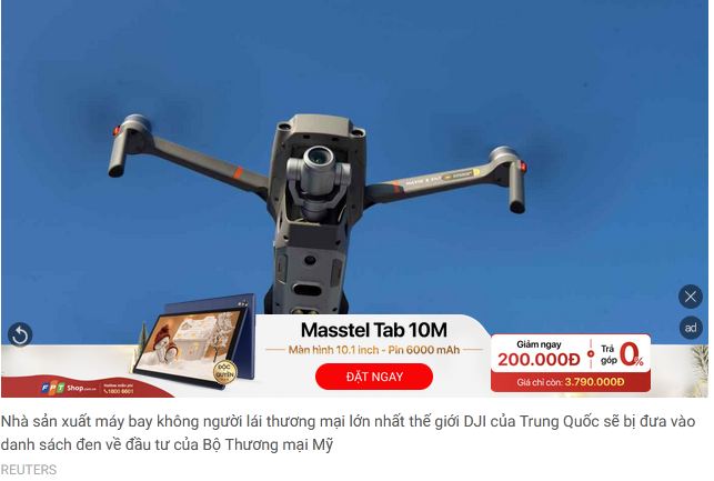 Nikkei Asia dẫn lời hai nguồn tin cho biết Bộ Tài chính Mỹ ngày 16.12 sẽ đưa DJI và các công ty khác vào danh sách đen “các phức hợp quân sự-công nghiệp”. Danh sách này hiện bao gồm 60 công ty và các nhà đầu tư Mỹ bị cấm đầu tư vào các công ty này.