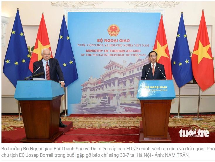 Nhận lời mời của Bộ trưởng Bộ Ngoại giao Bùi Thanh Sơn, Đại diện cấp cao Liên minh châu Âu (EU) về chính sách đối ngoại và an ninh, Phó chủ tịch Ủy ban châu Âu (EC) Josep Borrell thăm chính thức Việt Nam từ ngày 29 đến 31-7.