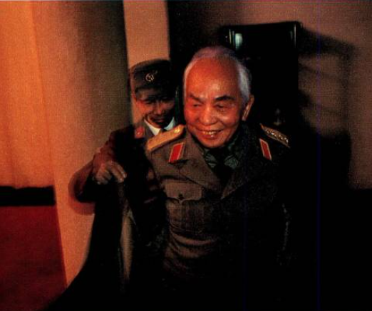Đại tướng Võ Nguyên Giáp, tên tuổi gắn liền với chiến thắng Điện Biên Phủ, là một trong những biểu tượng sống của Hà Nội. Ông mặc bộ quân phục trang trọng màu xanh thẫm, với phù hiệu màu đỏ viền vàng trên ve cổ áo và cấp hiệu 4 sao trên vai áo. Vào mùa hè năm 1989, ông gần 78 tuổi.