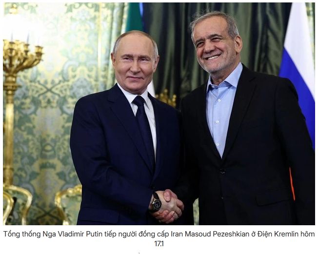 Hôm nay (17.1), Tổng thống Nga Vladimir Putin và Tổng thống Iran Masoud Pezeshkian đã hội đàm ở Moscow trước thềm lễ ký kết hiệp ước đối tác chiến lược toàn diện Nga-Iran, bao gồm thắt chặt quan hệ quốc phòng song phương.