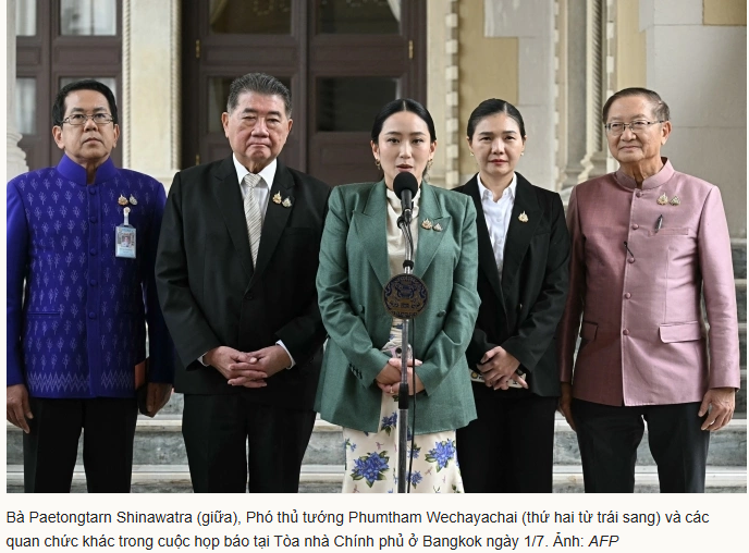 Ngày 1/7, Tòa án Hiến pháp Thái Lan đã ra phán quyết tạm đình chỉ chức vụ của Thủ tướng Paetongtarn Shinawatra, trong khi chờ xem xét vụ kiện yêu cầu bãi nhiệm bà. Trong thời gian Shinawatra bị tạm đình chỉ chức vụ, Phó thủ tướng Suriya Jungrungreangkit sẽ là quyền thủ tướng.