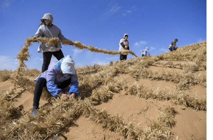 Tại làng Changliushui ở thành phố Trung Vệ, công nhân đã lắp đặt hàng rào rơm hình bàn cờ cuối cùng – một kỹ thuật cố định cồn cát và kiểm soát xói mòn do gió/bão cát cổ xưa nhưng rất thành công – nhằm khóa chặt đoạn cồn cát cuối cùng đang dịch chuyển ở khu vực Ninh Hạ thuộc sa mạc Tengger sau một dự án kiểm soát cát kéo dài hơn 6 thập kỷ.