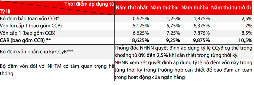 Điểm mới quan trọng hơn là sự xuất hiện của các bộ đệm vốn – cơ chế chưa từng có trong Thông tư 41. Những bộ đệm này giống như “quỹ dự phòng bắt buộc”, từ đó buộc các ngân hàng nâng CAR tổng thể lên 10,5% trong vòng 4 năm. Bên cạnh đó, Thông tư còn có thêm cơ chế cho phép NHNN linh hoạt điều chỉnh, yêu cầu ngân hàng tích lũy thêm vốn khi tín dụng tăng nóng để hạ nhiệt, hoặc “xả van” để hỗ trợ tăng trưởng khi kinh tế khó khăn.