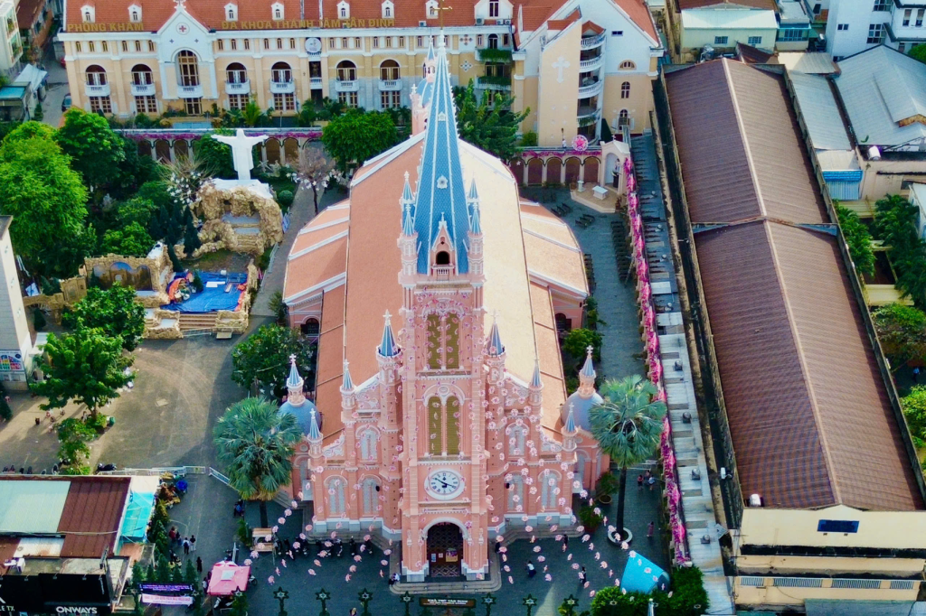 Hơn 1 tuần nữa là đến Giáng sinh 2025, không khí mùa lễ hội cuối năm đã lan tỏa khắp các tuyến đường TP.HCM. Trong dòng người đổ về các điểm vui chơi, những nhà thờ Công giáo trên địa bàn thành phố tiếp tục trở thành tâm điểm thu hút du khách. Nổi bật trong số đó là “nhà thờ hồng” đặc trưng nằm bên chợ Tân Định (phường Xuân Hòa, quận 3 cũ).
