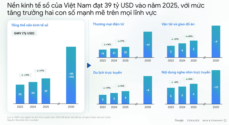 Tất cả các lĩnh vực chủ chốt của nền kinh tế số tại Việt Nam đều ghi nhận tăng trưởng ở mức hai chữ số. Trong đó, thương mại điện tử tiếp tục là ngành đóng góp lớn nhất vào tổng giá trị hàng hóa của Việt Nam, chiếm 2/3 tổng quy mô nền kinh tế số và được dự báo tăng 17%, đạt 25 tỷ USD vào cuối năm 2025.