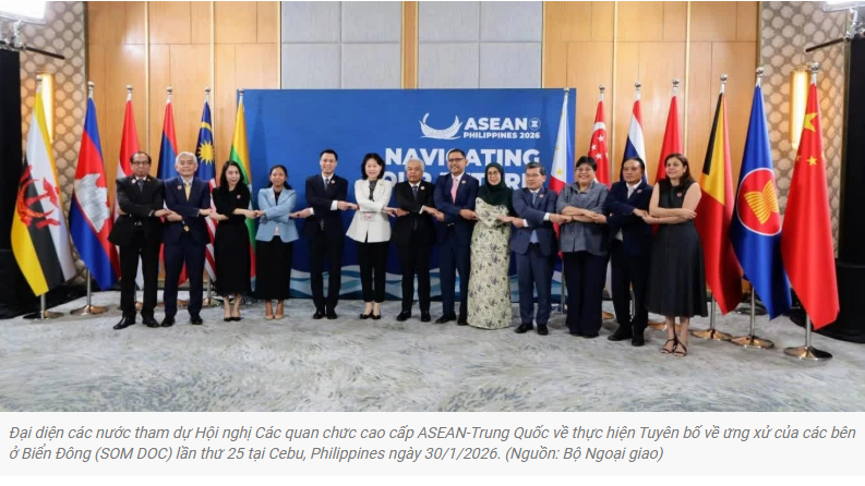 Ngày 30/1, tại Cebu (Philippines), Hội nghị Quan chức cao cấp ASEAN -Trung Quốc về thực hiện Tuyên bố về ứng xử của các bên ở Biển Đông (SOM DOC) lần thứ 25 tái khẳng định những nguyên tắc cốt lõi đã được hai bên nhất trí trong nhiều năm qua: duy trì hòa bình, ổn định; kiềm chế; thúc đẩy đối thoại; và đẩy nhanh đàm phán nhằm sớm đạt được một COC hiệu lực, thực chất.